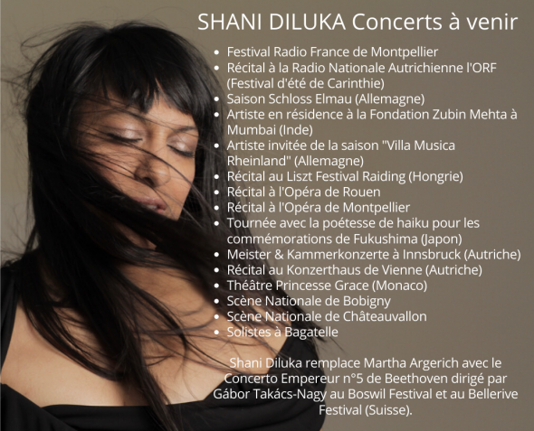 ![]() Quelques mots de Shani Diluka en ce contexte douloureux : A tous, courage en cette période difficile. Au bout du tunnel, espérons un monde meilleur où l’empathie sera un mode de vie, l’altruisme un modèle de société. Redonnons la place à ceux qui soignent, nourrissent, éduquent et cultivent. —————————— La musique a plus que jamais sa place : elle rassemble, console et nous élève. —————————— Cependant, quelques perspectives optimistes pour les mois à venir: Shani Diluka est invitée au Konzerthaus de Vienne, au Festival de Radio France de Montpellier, au Festival Raiding Liszt en Hongrie, aux fameuses Schubertiades de Hohenems en Autriche mais aussi sur les Scènes Nationales de Chateauvallon et MC 93 Bobigny. Shani prolonge également sa collaboration avec l’Orchestre de Chambre de Paris par un projet important auprès des détenus du Centre de détention de Meaux dont elle a en charge la conception musicale. Shani remplacera également Martha Argerich dans une tournée avec Gabor Tabacs-Nagy et sera artiste en résidence à la Fondation de Zubin Mehta en Inde ou encore au Festival Villa Musica en Allemagne. Enfin, le disque Cosmos, premier disque de Shani Diluka en tant qu’artiste exclusive Warner Classics, reçoit un accueil exceptionnel et donnera lieu à de nombreuses dates. Plus d’information sur le site internet de Shani . ![]() ![]() * Ces dates sont sujettes à modification, annulation ou report suite à la situation actuelle. * —————————— Revue de presse Cosmos —————————— ![]() FRANCE INTER : « Un Beethoven mystique. C’est très beau car l’interprétation de Shani Diluka a une propension à transmettre toute l’humanité qui se dégage de cette musique. Il y a une lumière qui émane de son jeu très incarnée sans jamais être ostentatoire. » Anna Sigalevitch LE FIGARO : « Un disque qui s’écoute comme une invitation au voyage et à la méditation. Sans doute l’un des projets les plus insolites de cette année Beethoven. » ? Thierry Hilleriteau FRANCE CULTURE : « Une poétesse et pianiste pour qui l’harmonie de l’univers, (…) du sel de nos larmes fait trembler. Shani Diluka est sensible à la vibration du monde. Elle nous offre une vision originale de Beethoven. » Caroline Broué GANG FLOW : « Cosmos est un disque qui nous élève. Shani Diluka perpétue la tradition de ces grands interprètes qui lisent la musique comme un texte de sagesse, posant ainsi une pierre personnelle sur le chemin de ceux qui ont pour religion la profondeur et l’exigence au service de l’humanité. » Anne Sandrine Girolamo BLOG MUSIC’ACTU : « L’aspect mystique intemporel et contemplatif de l’une fait écho à la fougue et la passion romantique de l’autre contenant aussi sa part de méditation. N’expriment-elles pas finalement un même effet de transcendance dont la musique est le medium associant le spirituel et l’organique ? » Consultez chaque article en cliquant sur la citation correspondante. Retrouvez la revue de presse complète ici! Et découvrez Shani dans le Pianiste Magazine du mois de mai et dans leur série « Piano-Minute » qu’elle a inauguré sur les réseaux sociaux. Vidéo de présentation Shani Diluka artiste Warner : https://www.youtube.com/watch?v=GgAhaWKZ88Q —————————— Actualités —————————— ![]() WATCH, est un projet exceptionnel, avec les détenus de la Prison de Meaux autour de la musique de Schubert et de la question du Temps, à l’initiative de l’Orchestre de chambre de Paris, de la MC 93 Bobigny et de La Maison de la Poésie. Découvrez dans la vidéo ci-dessous le travail mené par Shani, en charge de la conception musicale. Cette matière sera ensuite mise en scène par Olivier Fredj. Et rendez-vous cet automne où, musiciens, comédiens et détenus, seront tous rassemblés sur scène. https://www.youtube.com/watch?v=Gj8HXqr16Qs —————————– Le monde d’après… —————————— Shani Diluka a été invitée à participer à un festival « virtuel » exceptionnel : L’Académie du Monde d’Après, pour repenser le monde après cette crise, avec entre autre Yann Arthus Bertrand, Marion Cotillard, Renaud Capuçon, Juliette Binoche, des soignants, des agriculteurs, des scientifiques… Retrouvez toutes les informations sur le site : https://www.academiedumondedapres.org/ —————————— BOOKING L’Agence, Clémentine Richard et Clément Ledoux crichard@lagence-management.com 01 47 70 46 13 COORDINATION, ASSISTANTE Manon Viau assistantshani@gmail.com 06 43 47 61 52 ©Photos/Vidéos : Samuel Boujnah, This is my video, Sandrine Expilly, Pierre Morales. © 2019 Shani Diluka |