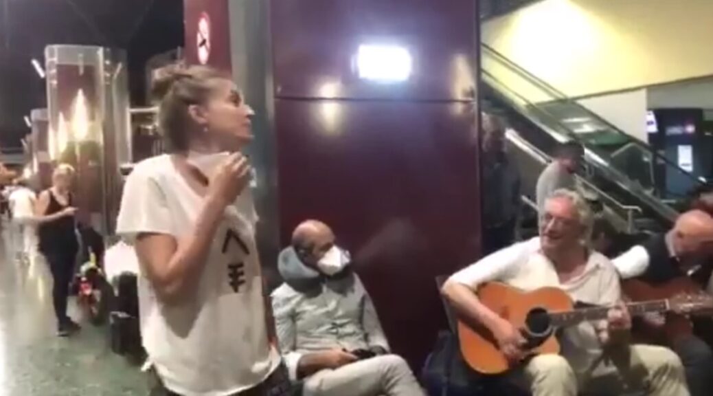 Lison, de « Ritournelles », et quelques musiciens rencontrés sur place, improvisent en attendant à l’aéroport de Saint-Denis de La Réunion.